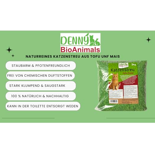 Denny BioAnimals Tofu Katzenstreu 30 kg/ 80L (10 Säcke je 3 kg)- Schnell klumpend & staubfrei- 100% pflanzlich, biologisch abbaubar- Leichtes Klumpstreu mit Geruchskontrolle, im WC entsorgbar