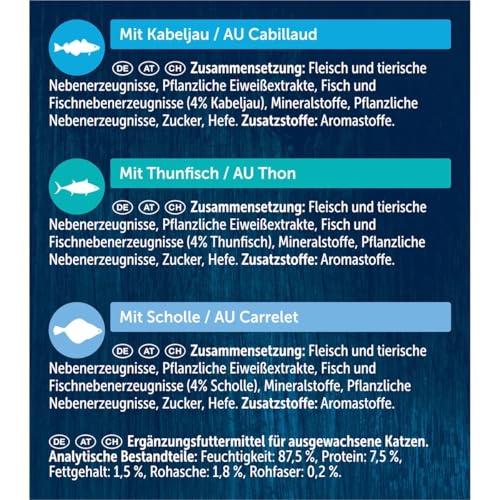 Köstliche Katzensuppe mit feinen Stücken in Kabeljau, Thunfisch und Scholle. Großpackung mit 48 Einzelportionen (8 x 6 Beutel à 48 g) – ideal als Ergänzung oder Snack. Hoher Feuchtigkeitsgehalt unterstützt den Wasserbedarf.