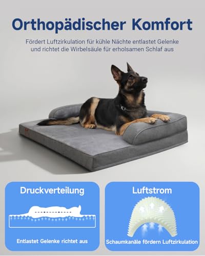 Orthopädisches, waschbares Hundebett für große Hunde mit drei Randseiten und rutschfester Unterseite. Egg-crate-Schaumstoff entlastet Gelenke; Bezug abnehmbar und maschinenwaschbar.