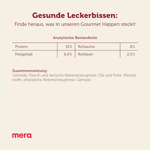 ZEIG DEINE LIEBE MIT MERA Bakery Gourmet Happen. Diese Hundeleckerli eignen sich perfekt fürs Training oder einfach als kleine Verwöhnung zwischendurch. Die Kekse sind schonend gebacken, lecker und dabei leicht verdaulich – ideal für Hundebesitzer, die Wert auf natürliche Zutaten legen. Dank einer einfachen Rezeptur lassen sich knusprige, frische Kekse im Handumdrehen herstellen, mit wenig Fett und wertvollen Mineralien. Die knusprigen Leckerlies krümeln nicht und fetten nicht, sodass sie sich bequem beim Spaziergang oder Training einstecken lassen. Hergestellt in Deutschland aus erstklassigen, regionalen Rohstoffen und regelmäßig kontrolliert in Lebensqualität.