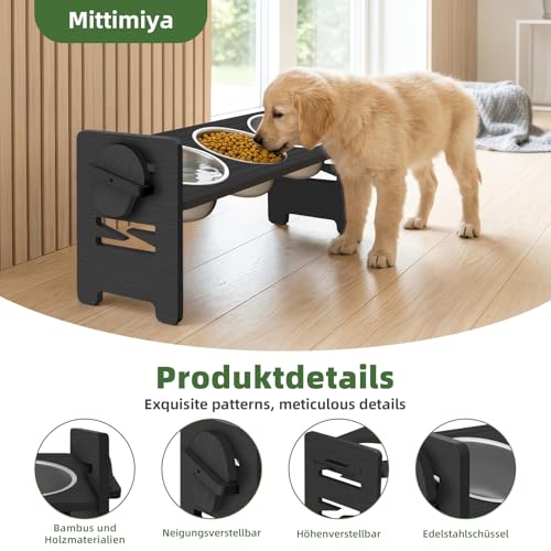 Mittimiya 6 Hundenapf Höhenverstellbar, Hundenapf Erhöht aus Bambus mit Langsamfresser und 3 Edelstahlnäpfen, Futterstation Hund für Kleine Hunde und Katzen(Schwarz)