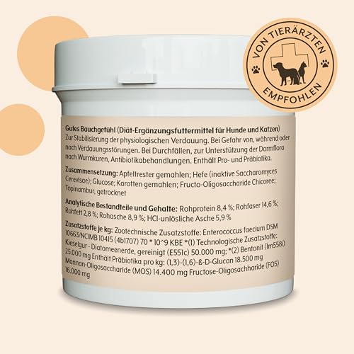 PANVITAL Probiotika Hund Pulver [Gutes Bauchgefühl] 150 g ist eine Verdauungslösung für Hunde und Katzen, die den Darmfloraaufbau unterstützt und Durchfällen entgegenwirken kann. Das Pulver wird von Tierärzten empfohlen und zeichnet sich durch eine hohe Wirksamkeit, gute Verträglichkeit und Akzeptanz aus. Anders als Snacks enthält es keine Hilfsstoffe; jeder Inhaltsstoff zielt darauf ab, Verdauung zu verbessern und das Gleichgewicht der Darmflora zu fördern. Die Anwendung erfolgt einfach: Das Pulver unter das feuchte Futter mischen. Der Verdauungserreger enthält Probiotika und Präbiotika sowie weitere hochwertige Rohstoffe wie Bentonit, Bierhefe, Kieselgur, Topinambur, Chicorée und Apfeltrester. Es eignet sich insbesondere nach Antibiotika oder Wurmkuren zur Stabilisierung der Darmflora und hilft bei Verdauungsstörungen, Blähungen sowie morgendlichem Erbrechen oder Reflux. Die empfohlene Fütterungsdauer liegt bei bis zu vier Wochen; bei Durchfall kann die Dosierung kurzfristig erhöht werden (1–2 Tage doppelt), danach auf die normale Menge reduzieren. Die tägliche Menge richtet sich nach dem Gewicht des Tieres (1 Messlöffel = 5 g pro 10 kg Körpergewicht). Ein Dosierlöffel liegt dem Produkt bei und ermöglicht eine einfache Handhabung im Alltag. Dieses Produkt ersetzt Kohletabletten und bietet eine gezielte Unterstützung des Verdauungssystems durch abgestimmte Inhaltsstoffe – ideal für gesunde Verdauung bei Hunden und Katzen.