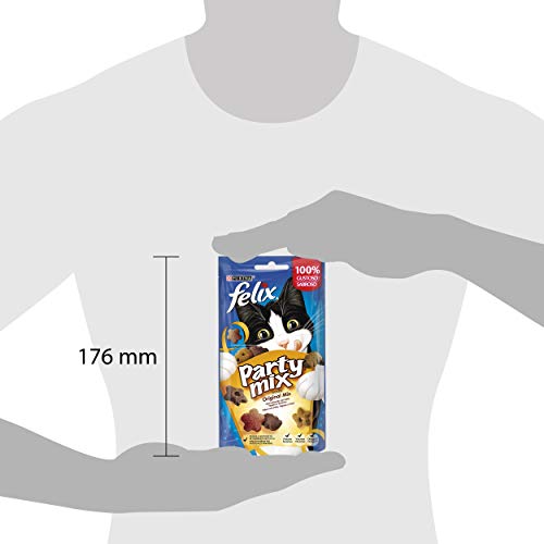 Purina Felix Party Mix Katzensnack Original- Mix mit Huhn, Leber und Truthahn bietet ausgewachsene Katzenvariante eine schmackhafte Belohnung in praktischen 8 Portionspackungen. Die knusprigen Snacks überzeugen durch aromatische Geschmacksnuancen aus Huhn, Leber und Truthahn sowie lustige Formen, die beim Kauen Spaß machen. Frei von künstlichen Farbstoffen, ergänzt dieses Ergänzungsfuttermittel die ausgewogene Ernährung Ihrer Katze und eignet sich ideal als Snack zwischendurch oder Belohnung. Die wiederverschließbaren 60 g Packungen sorgen für Frische und einfache Handhabung im Alltag.