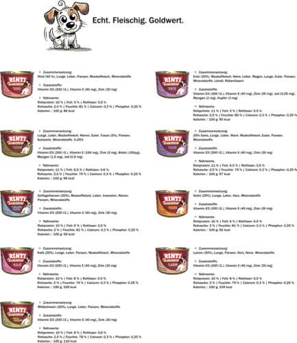 RINTI- Gold Hundefutter Bundle 10 x 185 g bietet kleinen Feinschmeckern eine besonders fleischreiche Nassfutter-Rezeptur mit 70 % Fleisch und Innereien. Das Set enthält ein 10er Pack 185 g-Dosen, die sich ideal portionieren lassen und Ihrem Hund eine frische, ausgewogene Mahlzeit garantieren. Frei von Formfleisch, Soja (pflanzliche Eiweißextrakte), Farb- und Aromastoffen – so erhält Ihr Vierbeiner natürlichen Genuss ohne unnötige Zusatzstoffe. Das Bundle umfasst fünf garantierte Sorten aus hochwertigen Fleischvariationen wie Wildschwein, Huhn, Ente, Gans, Fasan, Lamm, Geflügelherzen, Kalb und Rind, wodurch sich Abwechslung und eine abwechslungsreiche Ernährung kombinieren lassen. Durch schonende Zubereitung bleiben wertvolle Nährstoffe erhalten und echte Fleischstückchen sorgen für einen herzhaften Geschmack, den Hunde lieben. Die ideale Größe der 185 g-Dosen ist perfekt für kleine Hunde geeignet und unterstützt eine artgerechte Versorgung mit allen wichtigen Nährstoffen – weil Ihr Hund einfach Gold wert ist.